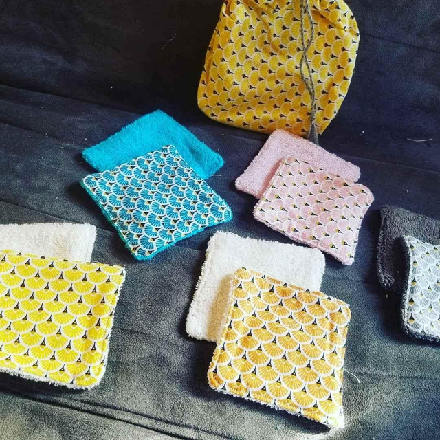 lot de 10 lingettes démaquillantes dans son pochon, face coton imprimé et face éponge de coton
